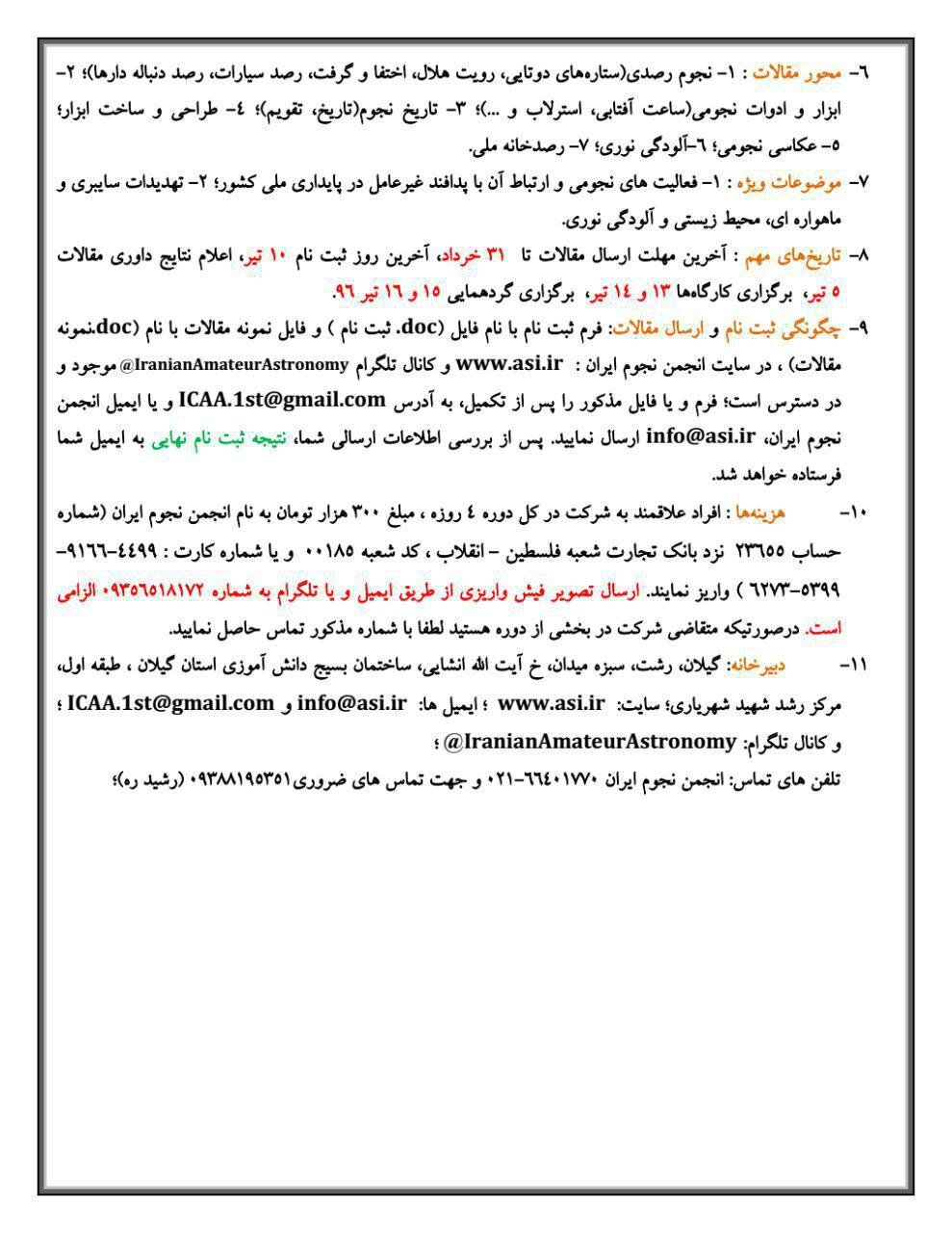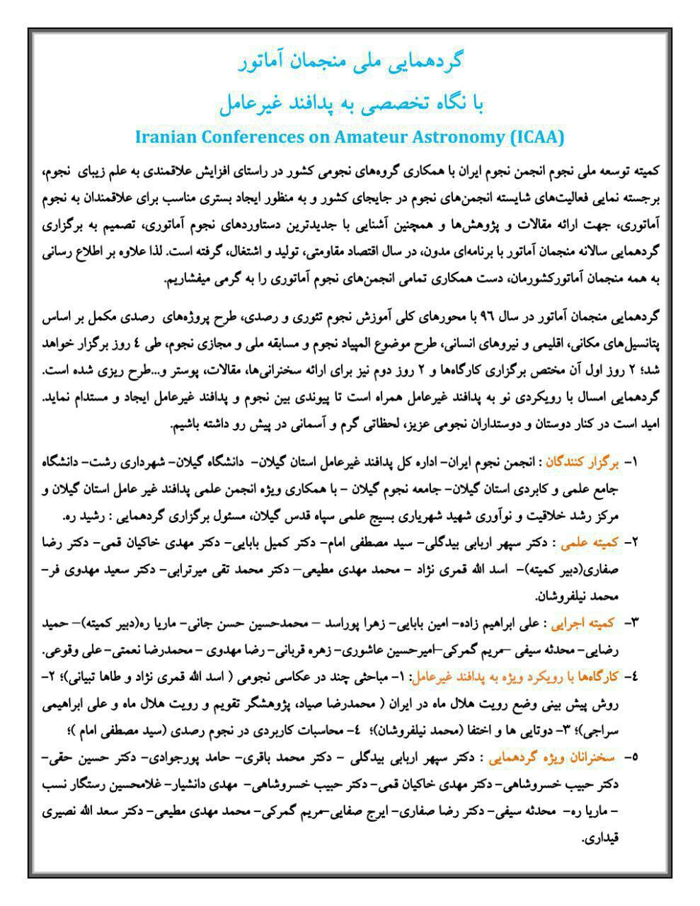"گردهمایی ملی منجمان آماتور در سال 1396 با نگاه تخصصی به پدافند غیرعامل" با همکاری دانشگاه گیلان از تاریخ 13 الی 16 تیرماه در استان گیلان برگزار می شود. به اطلاع کلیه دانشجویان و دانش آموزان استان گیلان می رساند، امتیاز برگزاری برنامه امسال طی ۴ روز از طرف انجمن نجوم ایران به جامعه نجوم گیلان واگذار شده و برنامه مذکور با یاری دانشگاه گیلان، پدافند غیرعامل استان و شهرداری رشت برگزار خواهد شد. لذا این امکان حاصل شده تا دانشجویان و اعضای هیات علمی علاقه مند کلیه رشته های دانشگاه گیلان (به صورت رایگان و با تقبل هزینه های مرتبط از سوی دانشگاه) در هر ۴ روز برنامه مذکور حضور داشته باشند و از سخنرانی دانشمندان و فرهیختگان نجوم کشور، بهره ی لازم حاضر را ببرند. گردهمایی امسال با رونمایی از عنوانی جدید از نجوم، "ارتباط نجوم با پدافند غیرعامل" همراه خواهد بود که شامل موارد ذیل است: - برخورد شهاب سنگها - اشعه های خورشیدی -تاثیرات ماه و خورشید بر زمین - ماهواره ها - آلودگی های نوری و صوتی - مواد مصرفی در پایگاه های فضایی - پزشکی فضایی و نجومی - تغییرات در اقلیم زمین - حرکت هواپیماها و فضا پیماها - رویت هلال ماه - جو زمین - زباله های فضایی - تجهیزات الکترونیکی (navigation) - هواشناسی - مخابرات و اینترنت - دسترسی به خاک سایر سیارات - عکاسی نجومی و مشاهدات عجیب - نجوم کروی و موارد دیگر که تا کنون مورد توجه همه کشورهای توسعه یافته بوده و می باشد. از فرهیختگان نجوم کشور، اساتید، دانشجویان و دانش آموزان دعوت به عمل می آید تا ضمن شرکت در برنامه ی فوق در ارائه بهترین تعاریف در راستای ارتقا امنیت و صلح بشریت با پدافند غیرعامل کشور همراهی نمایند. همچنین پس از گذراندن دوره ۴ روزه، به هر شرکت کننده دو مدرک ملی اعطا خواهد شد؛ یکی مخصوص دو روز اول گردهمایی که ویژه ۴ کارگاه تخصصی است و دیگری به جهت حضور در سمینار دو روزه به همراه دانشمندان نجوم کشور.
